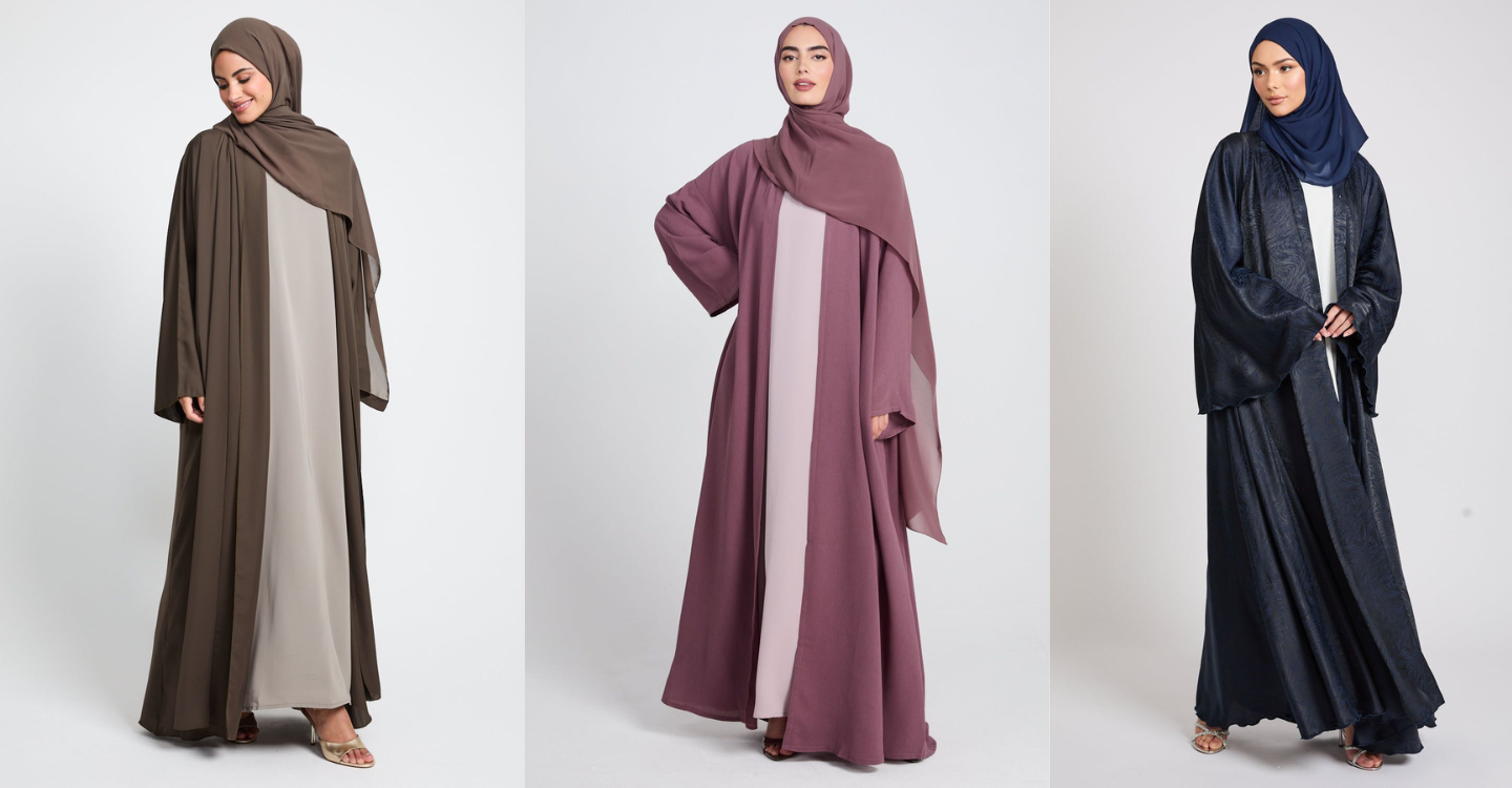 Model ini mirip outer atau cardigan panjang, biasanya dipakai dengan inner dress di dalam. Karena bisa dibuka di bagian depan, outer abaya ini serbaguna dan bisa dipadupadankan dengan berbagai gaya.